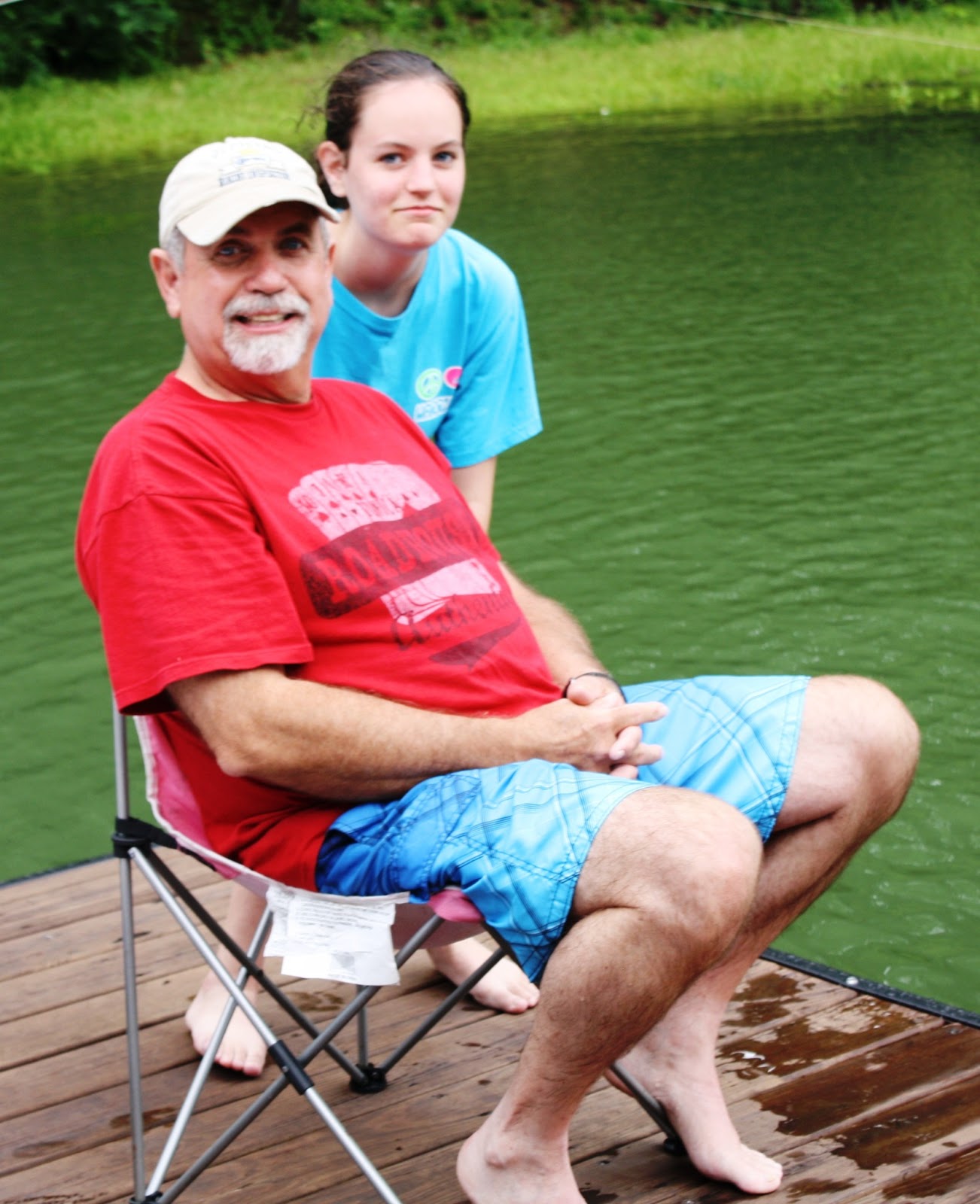 Speaking of being scared of nothing..... She has gotten extremely comfortable at Mimi's pool. She just walks off the side of the pool (she thinks she is jumping in) whether anyone is there to catch her or not. She has started having to wear her little float contraption at all times, because it is nothing for her to just barrel off into the pool without anyone looking. This is the process of her fun... over, and over, and over, and over.......